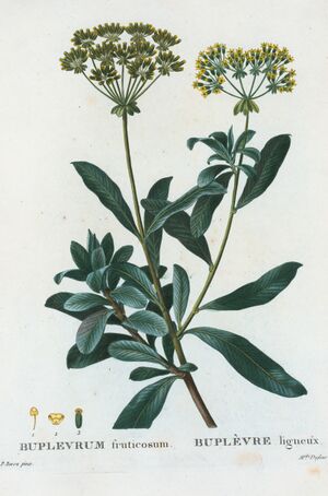 (_Bupleurum fruticosum_). Arbusto mediterráneo de la familia _Apiaceae_, conocido popularmente también como adelfilla, matabou, clujía fina, revientabueyes o limoncillo. Se extiende por países del sur ...
